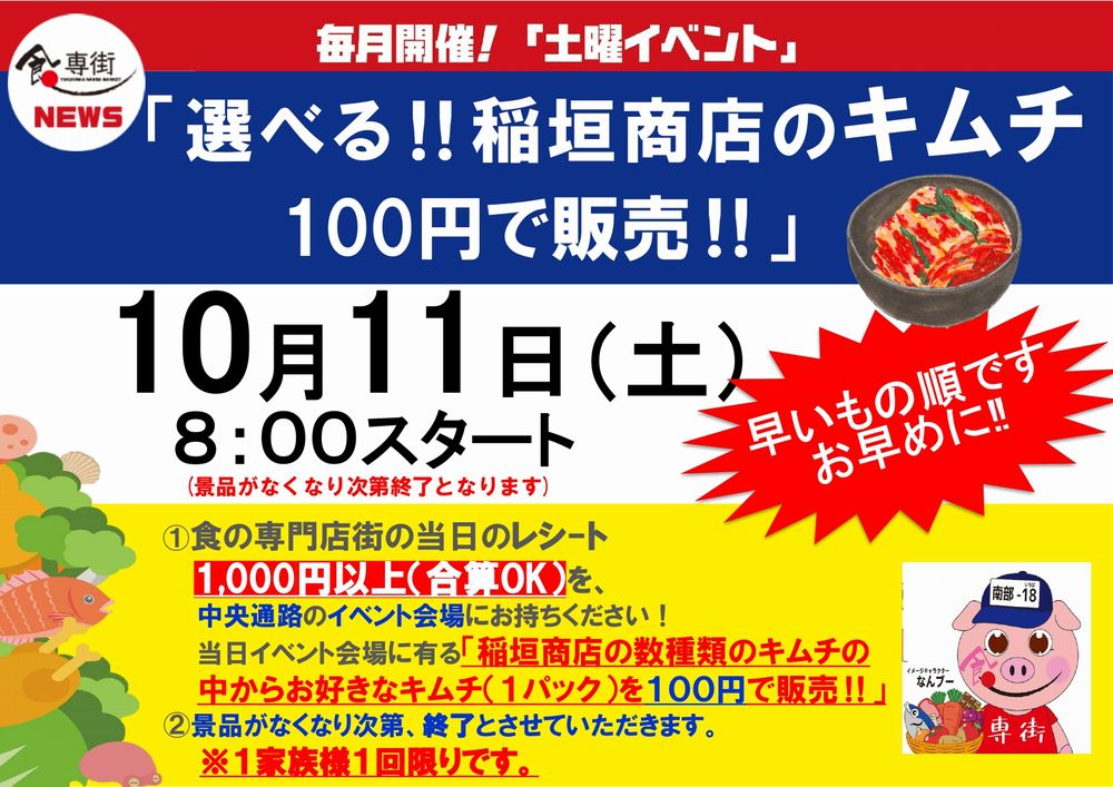 ・当日の食の専門店街のレシート1,000円以上(合算OK)を提示すると、当日イベント会場に有る「稲垣商店の数種類のキムチ」の中から1パックを100円で販売‼