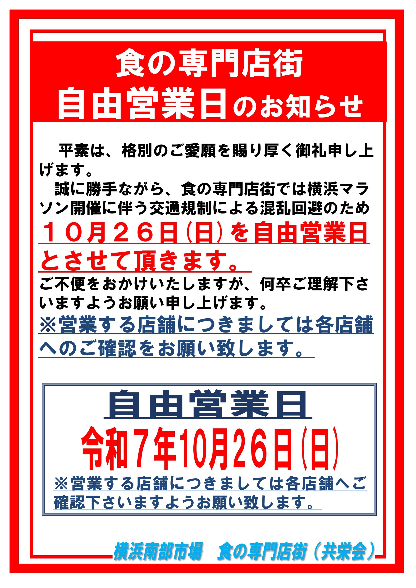 10月26日 日曜日 食の専門店街 自由営業日のお知らせ‼