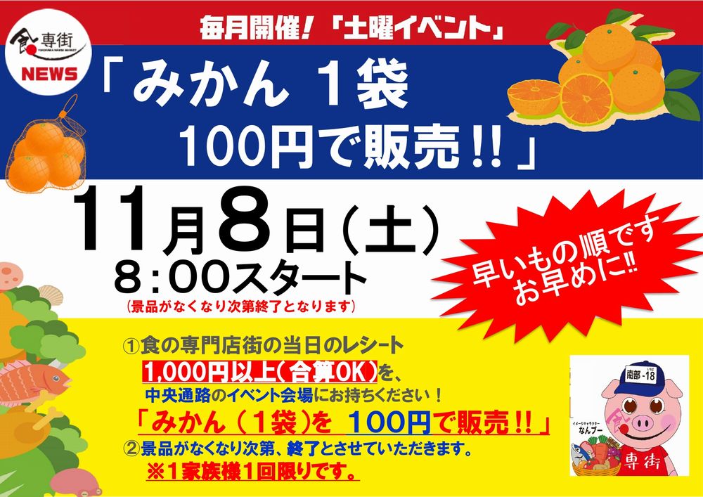 ・当日の食の専門店街のレシート1,000円以上(合算OK)を提示すると、当日イベント会場に有る「みかん」1袋を100円で販売‼