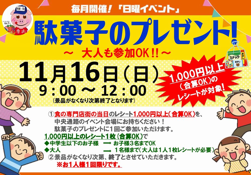 当日の食の専門店街のレシート1,000円以上(合算OK)をイベント会場で提示すると「駄菓子の詰め合わせ」のプレゼント!!