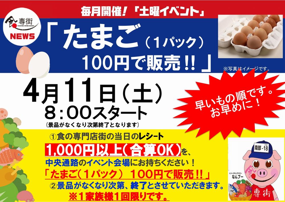 ・当日の食の専門店街のレシート1,000円以上(合算OK)を提示すると、「たまご 1パック100円で販売‼」