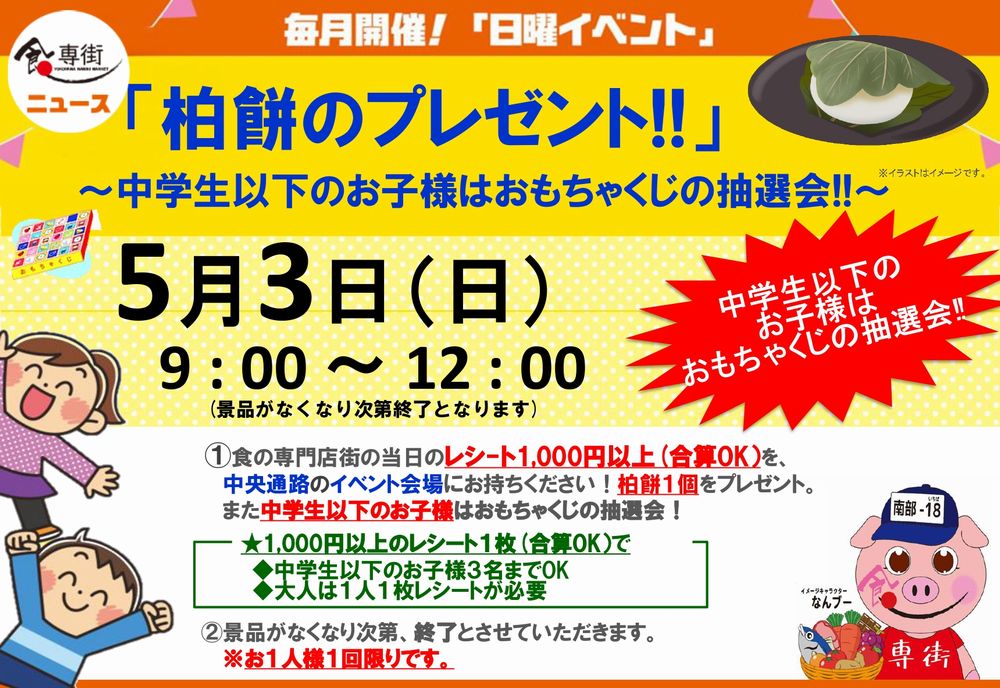 ・当日の食の専門店街のレシート1,000円以上をイベント会場で提示 すると「柏餅」1個をプレゼント!!